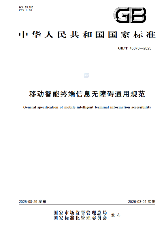 8月29日,由全国信息技术标准化技术委员会(SAC/TC28)提出并归口,国家市场监督管理总局、国家标准化管理委员会联合发布、深圳市联谛信息无障碍有限责任公司参与起草的国家标准《GB/T 46070-2025移动智能终端信息无障碍通用规范》正式发布,该标准将于2026年3月1日起正式实施。